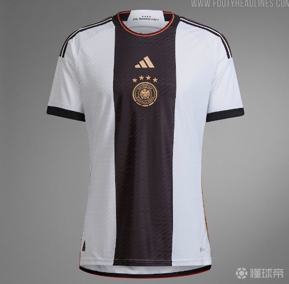 德国队2022年主场球衣将白色底色与黑色、金色相结合。金色的正式名称是“Tactile Gold Metallic”,顾名思义,这种金色具有金属的质感。