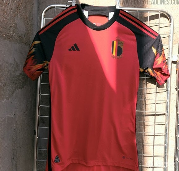 比利时2022年世界杯主场球衣以红色为主,带有黑色徽标和饰边,袖子上印有火焰图案。