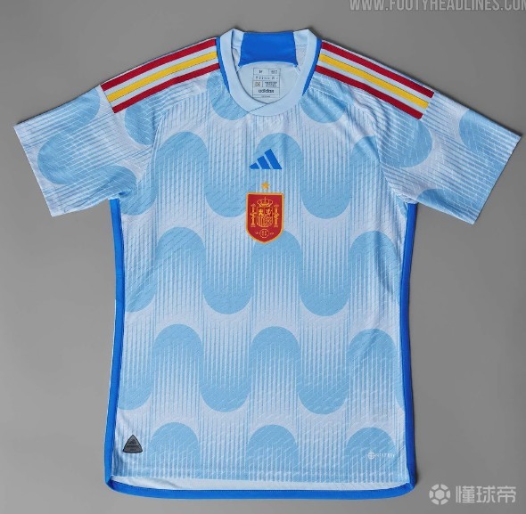 以天蓝色为主,带有抽象的图形图案,双肩上带有西班牙国旗颜色的三道杠,位于中央的阿迪达斯标志以及衣领上的饰边均为宝蓝色。