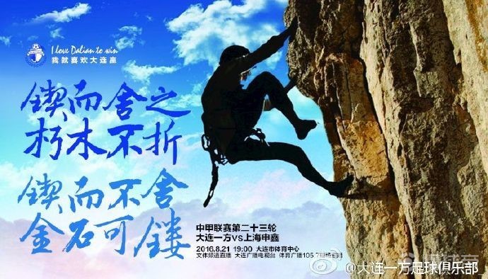 锲而舍之,朽木不折;锲而不舍,金石可镂出自荀子《劝学》,寓意是做事情要持之以恒,不轻言放弃。8月赛事是各队在本赛季抢分大战的关键时刻,大连一方目前少赛一轮排名中甲第5位,还有冲超的可能性,此次发布这样一张海报也是希望球员们不要放弃希望,鼓足干劲,在冲超的关键时刻能有好的表现。