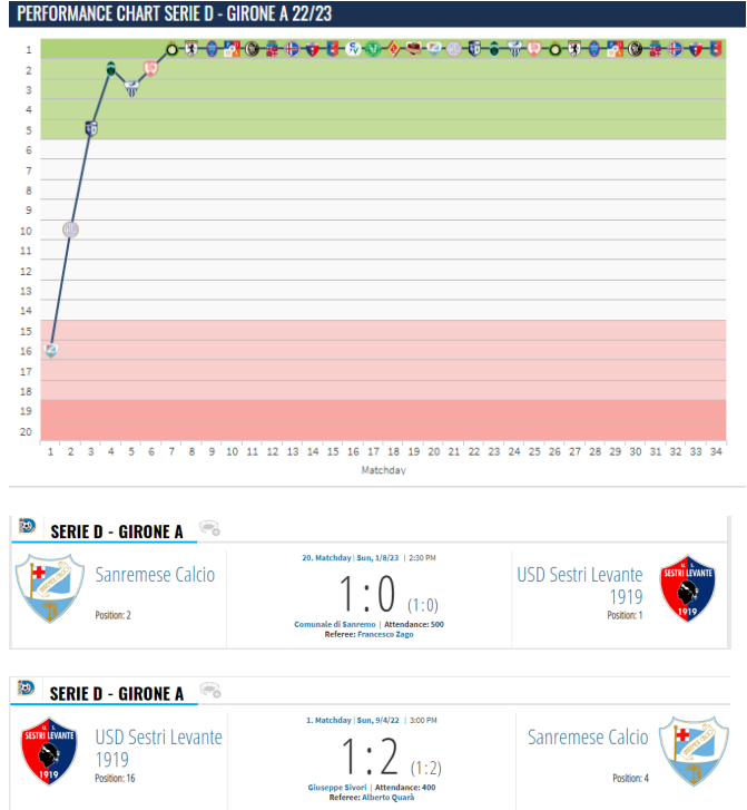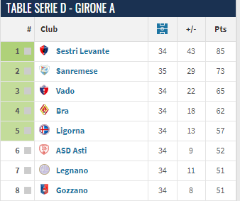 鉴于排名第二的圣雷莫人队多赛一场还少榜首12分,塞斯特里莱万特队便确认了升级成功。