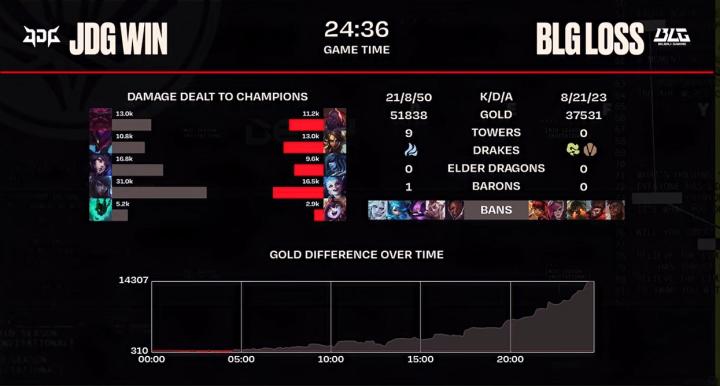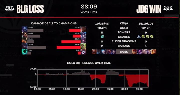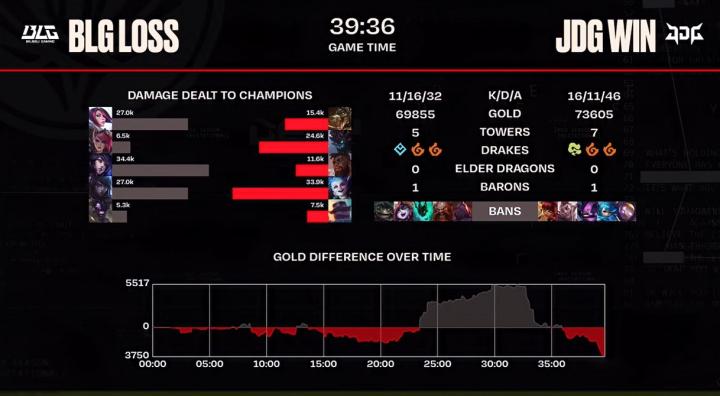 第38分钟,BLG抢到大龙,但后续团战不敌JDG被团灭,JDG结束比赛晋级胜者组决赛。