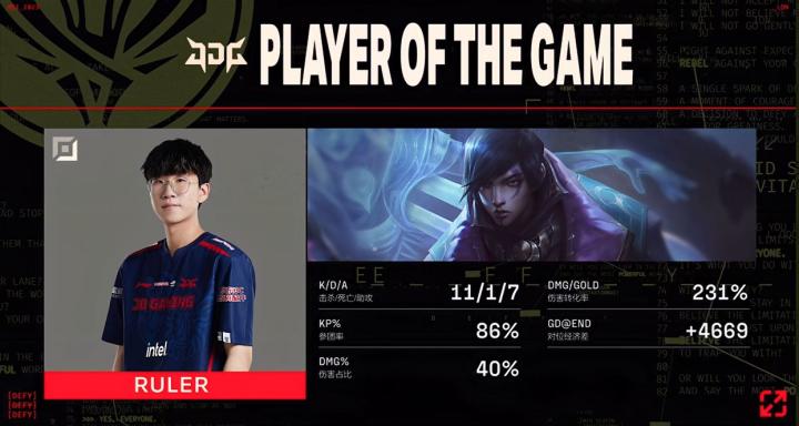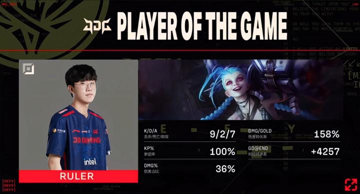 第39分钟,上路团战,JDG金克丝三杀打出1换3后推上高地连下两城,JDG拿下赛点。