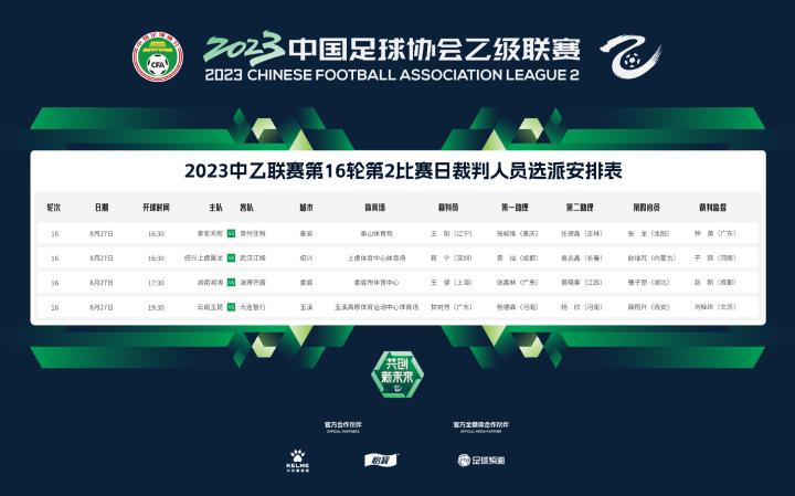 8月27日,2023赛季中乙联赛第16轮也就是决赛阶段第2轮,将展开最后4场角逐。赛前,中乙官方公布了这4场比赛的裁判人员选派安排表。
