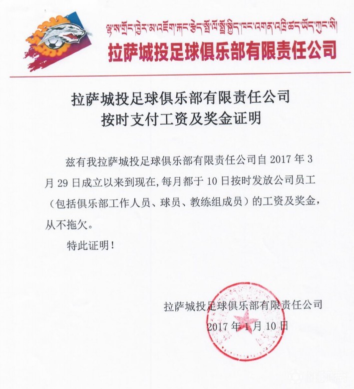 1月16日中国足协公布了参加2018年职业联赛,即将中超、中甲和中乙,俱乐部上交的不欠薪工资确认表。例如,国安虽然31名队员15人没有签字,但他们的通过微信的方式表示,他们不存在欠薪的行为。有一家俱乐部显得非常没有经验,他们就是中乙新军拉萨城投俱乐部,为了证明自己的不欠薪,他们的证明材料除了有银行的流水外,甚至还有队员的教练员的工资收入明细。