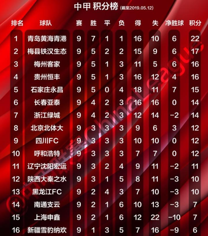 联赛9轮过后,青岛黄海积22分高居榜首。梅县铁汉落后5分,暂居次席。梅州客家和贵州恒丰同积16分,分列3-4名。长春亚泰近期状态不佳,目前排在第6位。上海申鑫排在倒数第二,新疆雪豹依旧排名垫底。
