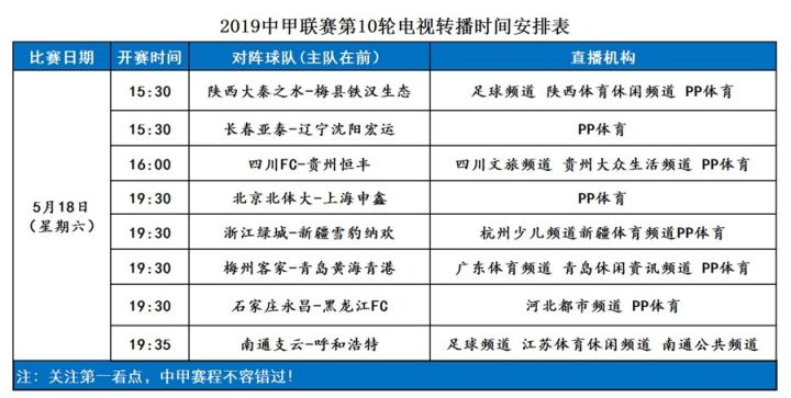 第一看点北京时间5月18日,中甲联赛第10轮将如期举行。根据赛程安排,本轮比赛将在一天内全部结束。其中,有6场比赛被安排在相关地方电视台直播,而其余两场只能通过网络直播收看。周六下午安排了3场比赛的直播,其余5场被安排在晚间黄金时段进行。有条件的朋友可以去现场助威,当然也可以选择在电视机前观看。具体的直播信息安排如下: