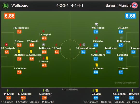 狼堡方面,送上关键助攻的德布劳内获得了全场最高的8分;拜仁方面,为球队打破僵局的罗本获得了全队最高的7.5分!