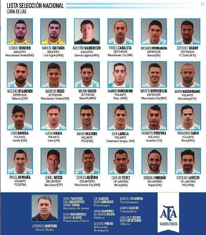 所有参加了美洲杯的23名球员全部入选,此外,1991年出生的来自河床的后卫莫里也在名单之列。在这份共24人的名单中,我们依然没有看到迪巴拉、比埃托、伊卡尔迪和被誉为“小马哥接班人”的克拉内维特的身影。
