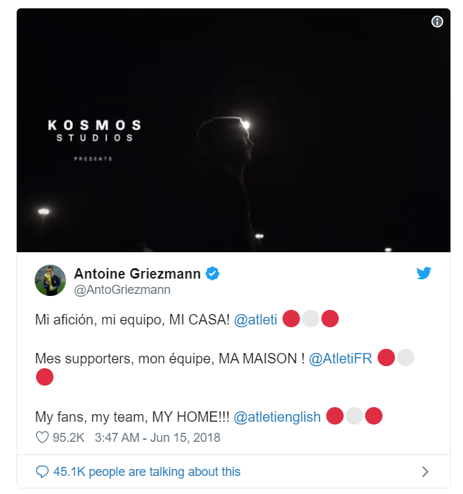 事实上,这桩本该合情合法的转会因5月份马竞一次偶然的发现被改变,当时马竞察觉出格里兹曼正在录制宣布离队的纪录片,俱乐部立即要求格里兹曼终止拍摄,并随即由本人出镜视频,亲承赛季结束后离队的消息。