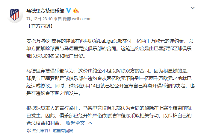 2.即便格里兹曼未来走人,新合同上涨的违约金也能确保马竞得到经济补偿。