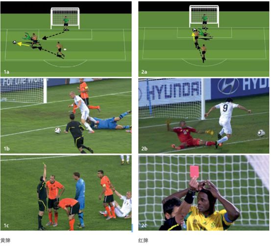 1. 如果进攻球员没有头球攻门,守门员并不会被罚出场, 因为他没有故意破坏明显进球机会。他将拿到黄牌警告,并判罚球点球(图中 1a-1c);