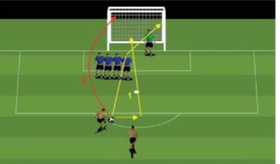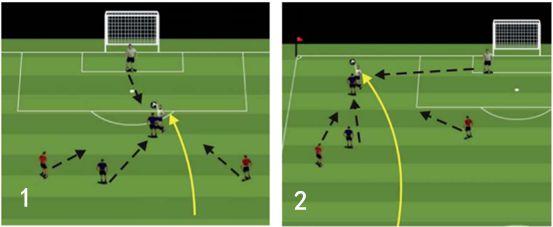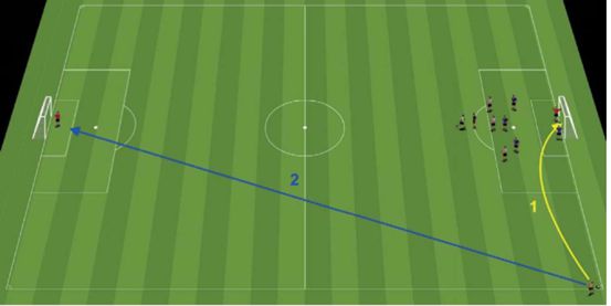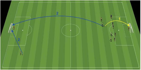 1. 进攻球员头球攻门时,守门员犯规(罚球区外)或故意手球(罚球区外)。守门员故意破坏明显进球机会—被罚出场,判对方直接任意球(图 1)。