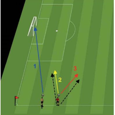 2. 球在侧翼发展,在进攻球员有机会控制球之前,守门员在罚球区外故意用手处理球。这种情况下,守门员不算故意破坏明显进球机会,因为球还没有被顶向球门。守门员被判为非体育行为,给予黄牌警告。判罚直接任意球(图 2)。