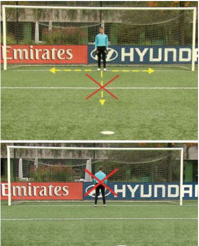 守门员必须站在球门线上,面对罚球点球人。守门员可在两个球门柱之间移动(但不得触碰球门柱)。可水平移动 和垂直移动(跳跃)。球被踢出后,守门员方可有向前移动。