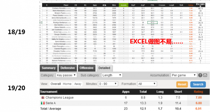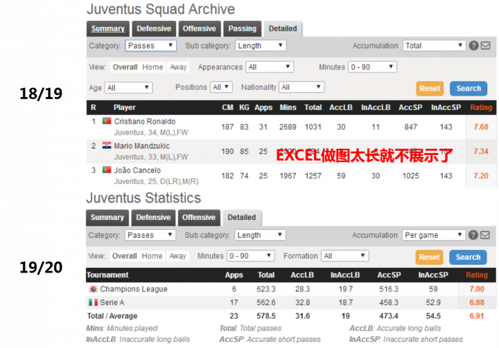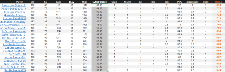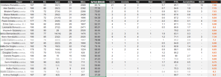 对于这一点,再多的言辞也远不如数据来的更加直观。因此,笔者利用whoscored的数据统计和伟大EXCEL软件对上赛季与本赛季至今的斑马将士们的场均比赛时间进行了统计。