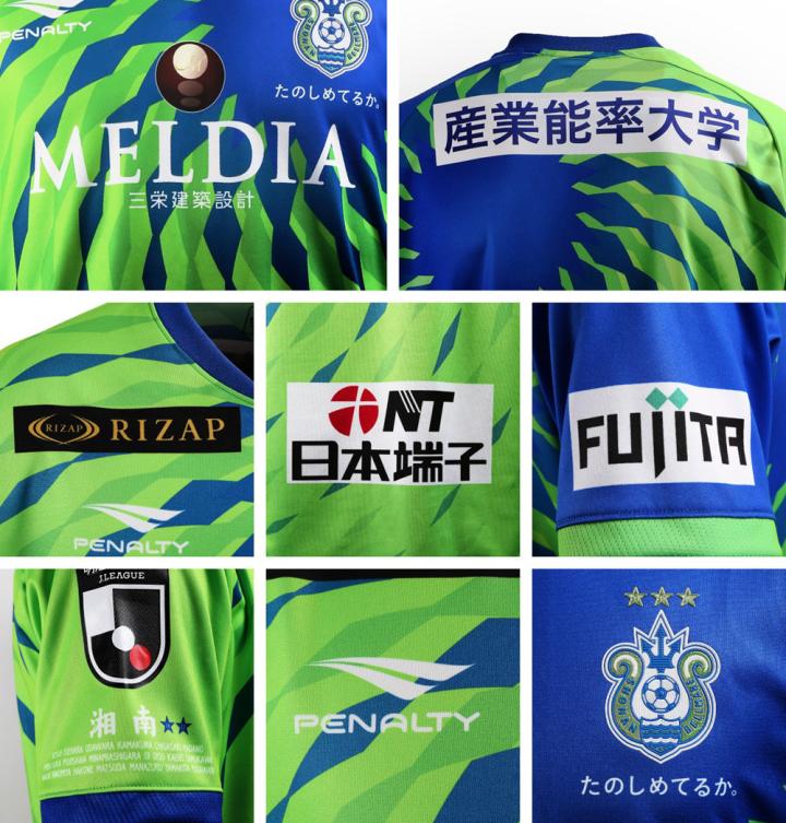与此前几个赛季的主场球衣相同,球衣胸前队徽下方加入俱乐部口号“たのしめてるか。”(能否乐享其中)。右袖上加入球队名称“湘南”,并加入球队所代表的9市11镇名称,并附上代表两次赢得J2联赛冠军荣誉的蓝色五角星。