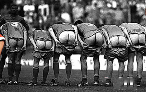 据说在早年,温布尔登队为了取得比赛胜利无所不用其极,主场比赛的时候,甚至往客队的饮料里撒盐,从来不打扫客队的更衣室,更别提装暖气,客队去了温布尔登经常怀疑人生。所以成为了英足总挂名督办单位,年年遭到投诉最多,处罚也最多。当年的温布尔登队是这样露出屁股迎接对手和球迷的,有人说这个动作是模仿梅尔吉布森的电影《勇敢的心》里的战斗场面,但据我所知,这个照片要比1995年上映的电影发生的更早,所以这是温布尔登原创。