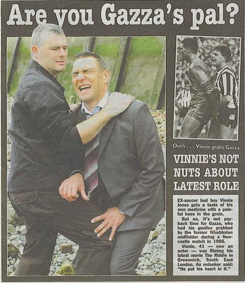 除了扮演球员,琼斯还扮演过球迷,只不过他扮演的是英国特产足球流氓,在电影《欧洲性旅行》中他扮演一位曼联球迷,带着一群足球流氓去巴黎客场看球的故事,在片子里,他居然还演出了眼皮开啤酒瓶的绝技,令人大开眼界。在电影《THE RIDDLE》中琼斯在片中被人踢裆,英国媒体拿这个镜头和他当年掏裆加斯科因对比开玩笑。和他劣迹斑斑的足球生涯一样,琼斯的演员生涯也不含糊,演了六十五部电影,其中四十六部扮演的是流氓,十七部电影中梦想成为一名流氓,还有两部在成为流氓之前就挂了。这就是足球历史最牛逼的演员维尼琼斯。