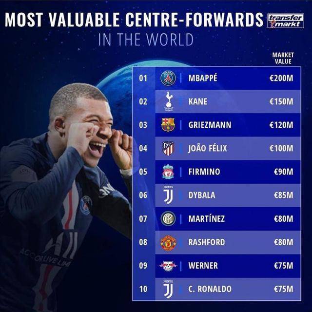 近日,年仅21岁的姆巴佩在德国转会市场的最新世界足坛中锋位置身价排行榜中,以2亿欧元的身价位居世界第一位,并且与位居第二名的凯恩的差距足足有0.5亿欧元,爆发力十足。