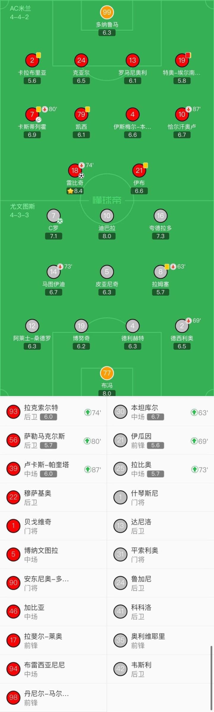 替补:1-什琴斯尼、31-平索利奥、13-达尼洛、42-韦斯利、24-鲁加尼、41-科科洛、35-奥利维耶里