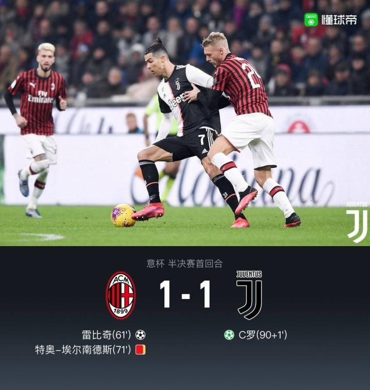 意杯米兰1-1尤文,C罗造点并主罚绝平,雷比奇建功,特奥染红