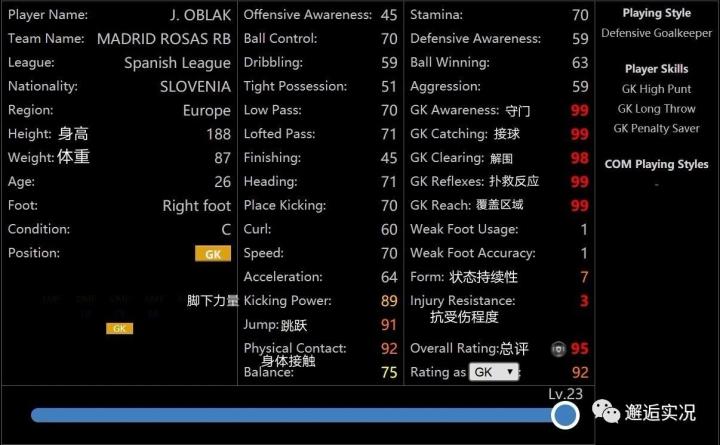 谁用谁知道,顶尖的防守型门将。精选奥布拉克99的反应速度,加上188cm的模型,使其下地速度极快。91的跳跃虽然不是顶级,但是高空球接球很稳,半高球扑救起跳很及时。98的解围比普卡高三点,不会出现很低级的失误。达到7的状态持续性,可以保证他连场首发,并保持高超水准。只可惜由于状态持续性相对稳定,很难发生状态变化从而进行隐性增益。