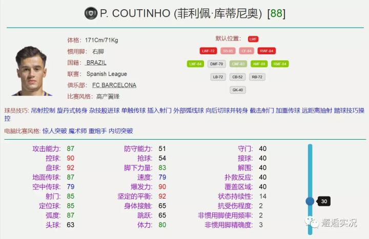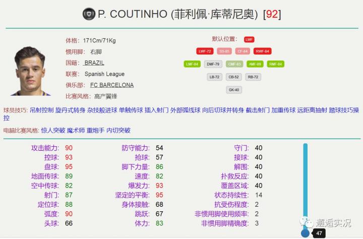 现在有两名左边锋摆在我们面前,我们以pes2019中的库蒂尼奥与萨内为例子。库蒂尼奥与萨内的30级评分(也就是现在的1级评分)分别为88和85,而他们的满级评分为92和93,首先在总评分上,满级的萨内就高过了满级的库蒂尼奥一截。