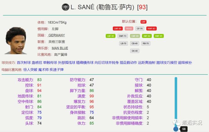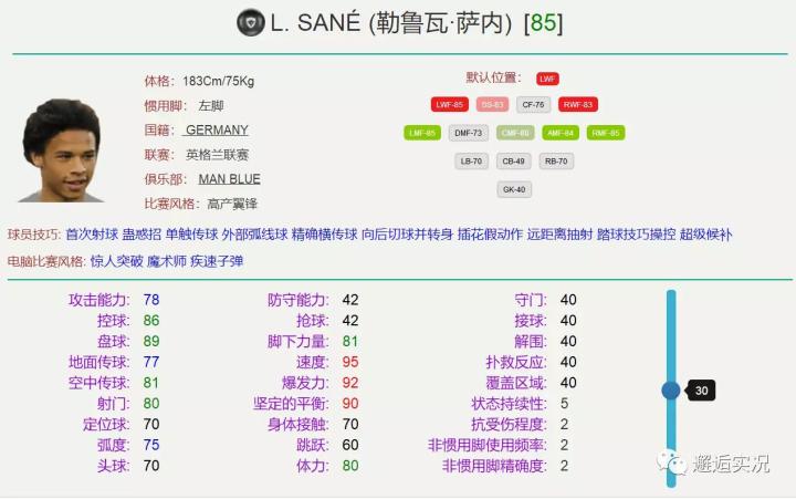 再比如,萨内在pes2019中,是一名底黑球员(pes2019中的30级评分85,也就是现在的1级评分85),但却牢牢占据天梯左边锋排行前列和各玩家阵容中的左边锋位置。这是为什么呢?我们来比较一下: