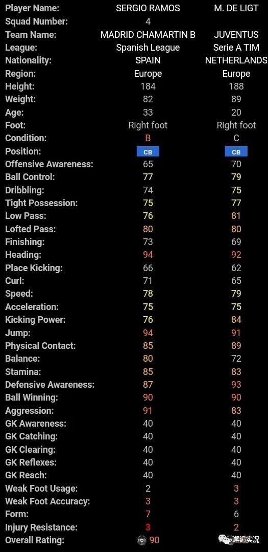 我们再来看看,90以上的“闪黑”与其他黑球的一个对比。在这里,我们拿出的例子是pes2020中的拉莫斯与德里赫特。
