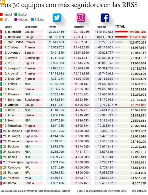 据《Sporting Intelligence》的调查数据,皇马是社交媒体上粉丝数量最多的体育俱乐部,在全球三大社交媒体推特、脸书和INS上,西甲豪门的粉丝数量达到了2.23亿。除了在总体粉丝数量上遥遥领先之外,皇马在每个社交媒体平台上的粉丝数量也位居榜首。