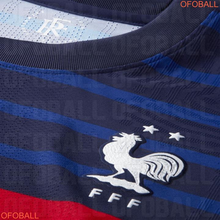 世界杯冠军法国队的主场球衣依旧为深蓝配色,胸前增加了红色条纹,以此来向1984年欧洲杯夺冠的那支法国队致敬。而客场球衣则为传统的白色,在球衣两侧印有红色、白色、蓝色的法国国旗配色条纹。
