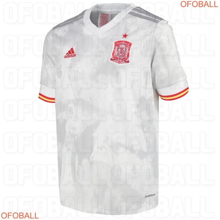 西班牙队主场球衣红色为主色调同时搭配黄色,该款球将艺术和足球文化相融合,在领口处印有1920 字样,纪念西班牙雄狮队徽诞生百年。而客场球衣则采用了现代感十足的浅灰色配色,而胸口的西班牙队徽选用了红色。