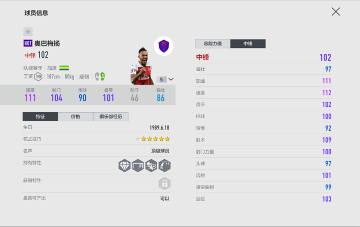 因此呢,打防守反击的小伙伴如果阵中有一张HOT-奥巴梅扬,我们大可摆起大巴,拿球之后就大脚找奥巴梅扬,让他跑。加蓬人187的身高不输很多中卫,并且我们可以将传球键稍微按大一点,以奥巴梅扬的启动速度,转身慢的中卫应该只能追着他的背影,目送单刀了。