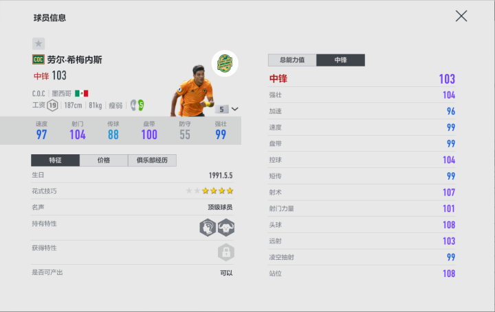 从数据上来看,希梅内斯的强壮数值是一大亮点,吃满加成的状态下,希梅内斯的强壮属性可以超过110,因此我们可以说这是一位能在禁区内站得住的中锋球员。从数据上来看,他的双速并不快,那么我们应该怎样发挥他的反越位特性呢?斜四十五度传中,或者说肋部传中应该是一个不错的选择,希梅内斯出色的站位数值可以给他更出色的跑位能力,加上强力头球,接来自身后的传中头球破门,应该是一套非常舒服的操作。此外他还有出色的远射能力,总之,只要不让希梅内斯去拼绝对速度,这应该是一位存在感蛮高的中锋球员。