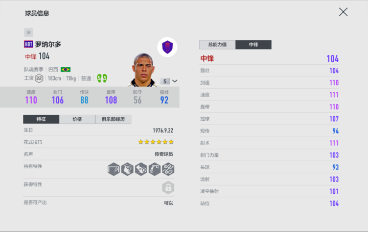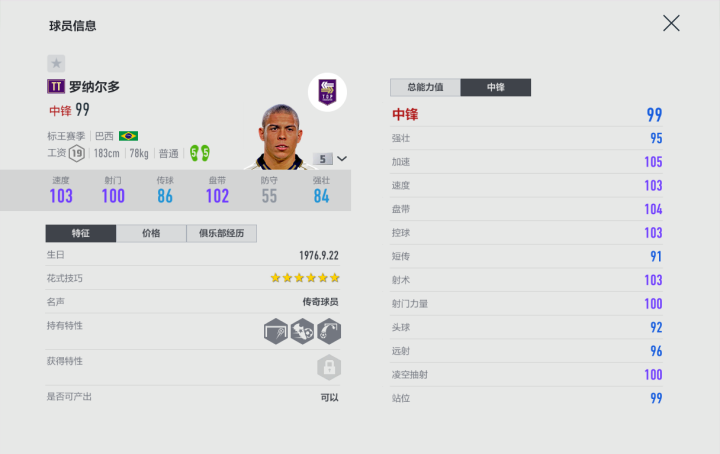 19工资的情况下,罗纳尔多的总评似乎并非十分有排面,有更多能力值更高的现役球员卡可以选择。不过看详细数据,对于中锋来说,最重要的射术、射门力量罗纳尔多并不算差,双五脚也给了他在任何位置射门的能力。并且在奔袭这个前提下,TT-罗纳尔多的双速在吃满队套的情况下均可突破110点,此外更出色的盘带和六星花式也值得一提,前者让罗纳尔多带球的手感非常舒服,后者则可以让他更轻松得抹过防守队员——没有单刀就自己造。