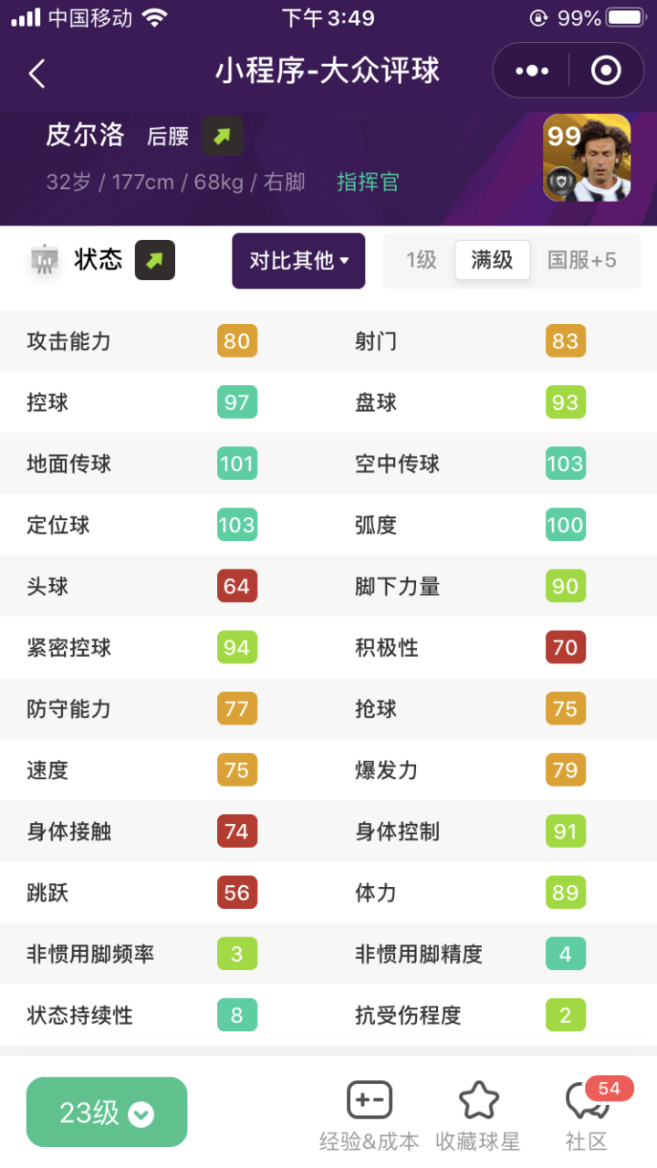 同样是即将登录实况国服的皮尔洛,科乐美选择了尤文时期而不非年轻的米兰时期,我想科乐美也是考虑到皮尔洛在重建的尤文有巨大的影响力,但碍于年龄数据成色并不是在巅峰,作为前腰后置第一人,皮尔洛传球自然好,但防守和速度都无法成为后腰首选,还待其他位置的开发。