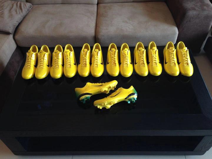 对于英超的职业球员来说,mv3这样的鞋估计穿不了很久就要换新的,当时莫德里奇基本上就是一双鞋踢不到10场比赛。所以到了2010年以后,莫德里奇也嫌麻烦换了sf1。此时mv3的价格应该比新款的sf1还要贵。所以收藏刺客3的人还是不少,不过nike的球鞋有一个致命的缺陷,就是鞋帮内衬等位置的材料特别容易氧化脱皮,到10年后的2016年,刺客3的氧化已经完全爆发,根本已经无法实战,只能作为摆设show一下情怀和品味,一下地鞋底就开裂,内衬吊皮,后跟锁定脱落。有一位国内的收藏狂人小宝就在早年收了7双大香蕉刺客3,当时前前后后花了2万多元收的,结果到了2018年后,都只能贱卖,还要被人说三道四。