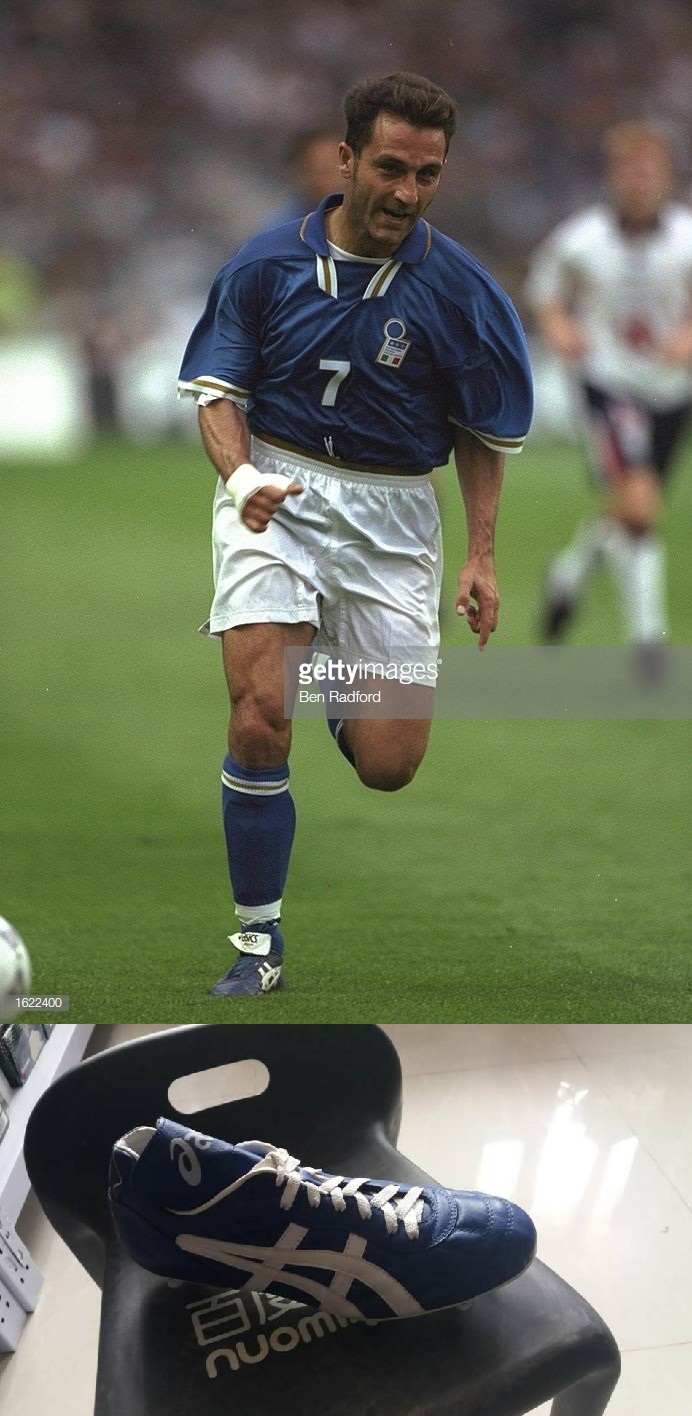 第三名又非常不可思议,居然是日本品牌asics,1997年四国赛上,意大利小巨人迪利维奥,居然使用了蓝色的asics testimonial足球鞋,不过迪利维奥从来就是个低调的球员,出道于意大利丙级联赛,穿蓝色球鞋可能只是为了搭配球衣。这款鞋也是意大利制造的。