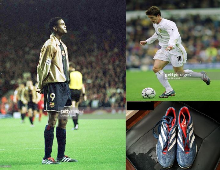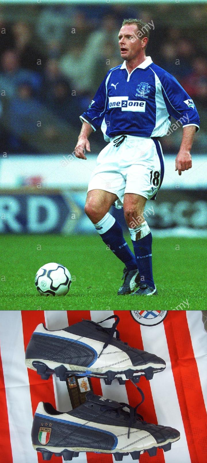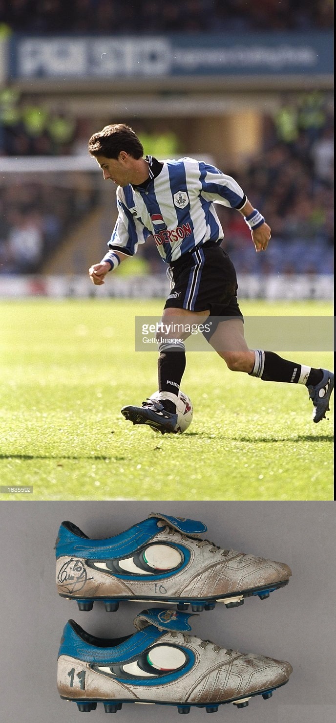 之后出现的蓝色球鞋是意大利个性球星卡博尼,这位在意甲并没有提出名堂的球员,96-97赛季从国米转会英超谢菲尔德星期三,后来在谢周三打出了一片天地,不过他穿的鞋还是意大利的pantofola品牌,而且还是蓝色的,和谢周三的球衣比较和谐,在当时的谢周三这样的中下游球队,意大利来的技术扶贫大使那毫无疑问是主角。