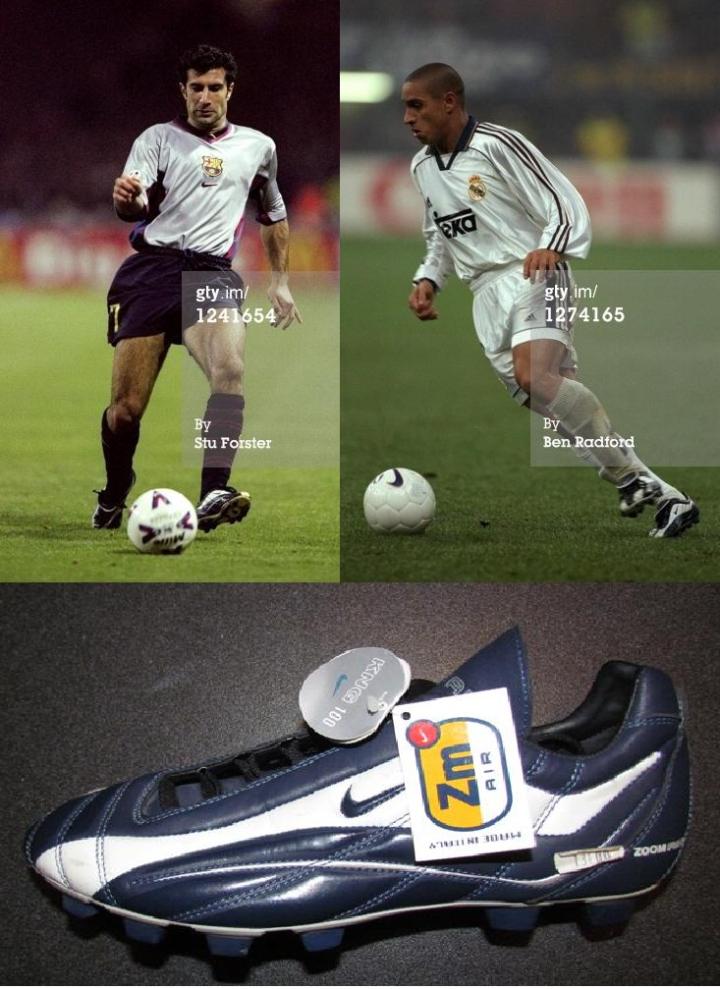 nike第一双蓝色为主的球鞋是1999年的air zoom italia,不过这款鞋是超纤鞋面,蓝色也是很深的那种,这款鞋是nike t90系列的祖宗,代言人也是一脉相承,当时巴萨的菲戈,皇马的卡洛斯都穿过,我相信大家一定有印象,这两位都算是当时响当当的人物。这款鞋也是意大利制造的。