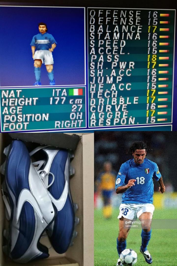另外一位穿蓝色球鞋比较有名的球员就是意大利队当时的中场技术型球星菲奥拉,在2000年欧锦赛表现非常出彩的他,当时使用的是valsport的era足球鞋,这款鞋的鞋面也是由蓝色和银色组成,所以在游戏中也被设定为蓝色球鞋使用者。