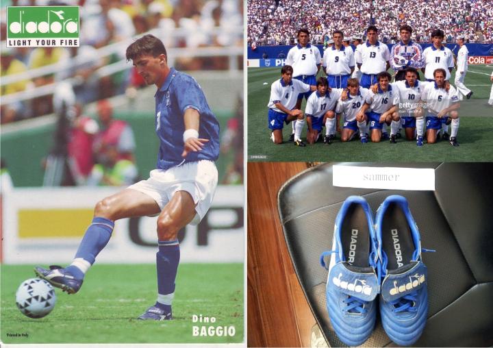 历史最早的蓝色球鞋出现在1994年世界杯上,我相信很多人一定有印象,当时意大利队三大球星,也是diadora的三大代言主力罗伯特巴乔,迪诺巴乔和西格诺里,在世界杯揭幕战对阵爱尔兰的比赛中,都使用了蓝色的brasil足球鞋,但是当时穿蓝色鞋绝对超凡脱俗,所以在之后,这三位有头有脸的人物都先后放弃了蓝色妖鞋,穿会了黑色球鞋。
