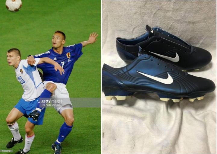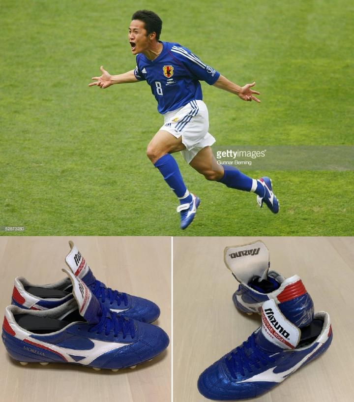 2002年世界杯上,日本还有一双非常特别的鞋,那就是日本国际森岛宽晃使用的m8 morelia妖蓝色,森岛宽晃当时一直使用交叉走线的morelia,这种走线被成为m8,蓝色m8当时并没有量产,但是后来mizuno发布了两款蓝色的morelia2,都以此为配色模板。