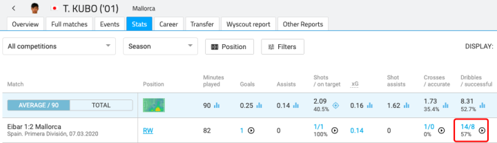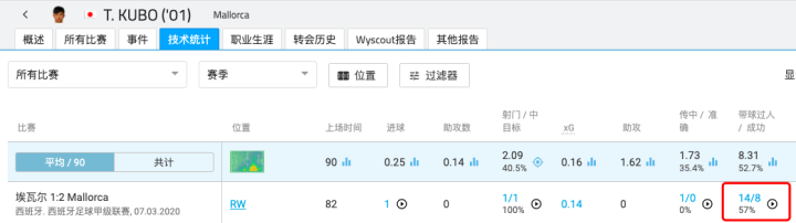 说回到久保同学,在wyscout统计里,马洛卡最近一次西甲是对阵埃瓦尔,久保同学的过人/成功过人是14/8