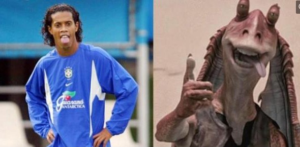 冈根人是《星球大战》系列影视作品里的种族,来自纳布星球的原住民。虽然说长得有点滑稽,但细看其实也挺可爱的。细看下来,是不是有一点巴西著名球星罗纳尔迪尼奥的味道?而且生长于热带雨林气候下的他们骨骼非常柔韧,没有硬骨,只有软骨,擅长复杂的华丽动作,也和小罗花哨的技术特点具有很高的吻合度,看起来小罗还真的没准有一点这个遥远外星民族的血统呢。