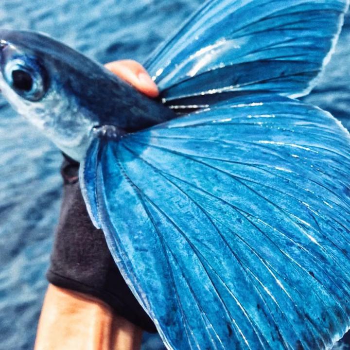 #刚钓上来的飞鱼,鱼鳍在阳光下闪烁着海蓝色。图/王生鲜