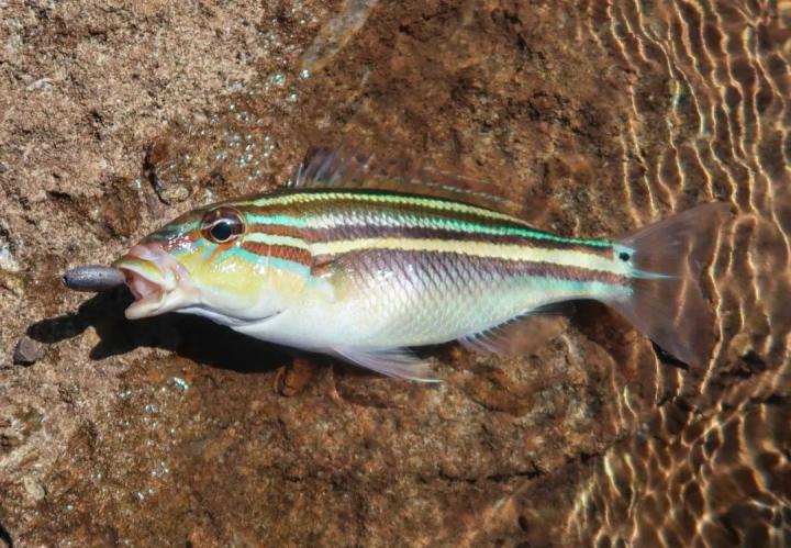 “水太清澈,直接甩竿会把鱼吓跑。一定要在远处下钩,把鸡肉不经意飘到大黄鲷面前,然后看着大小黄鲷轮流狂啄,就是不咬钩。我一次次把白嫖的小黄鲷丢回去,运气好的时候,就能骗起大黄鲷。