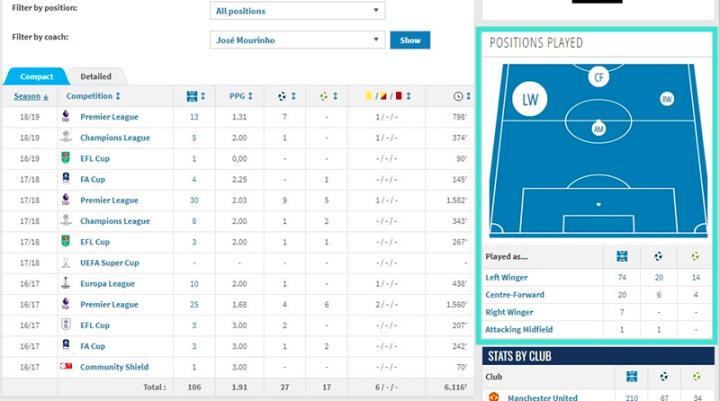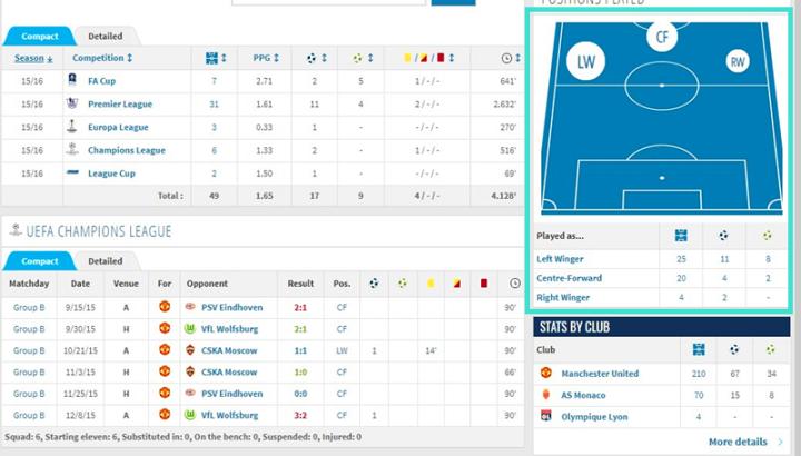 整个15-16赛季马夏尔取得了14个进球4个助攻,这在残酷的英超赛场对一个不满20岁的小将来说已实属不易。但比起在摩洛哥,主打中锋位置的马夏尔逐渐被名厨改造成边路球员。49场比赛超过一半改打边路。