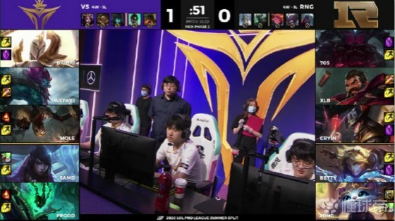第一局,RNG:猴子、盲僧、塞拉斯、EZ、泰坦。VG:奥恩、男枪、佐伊、寒冰、锤石。